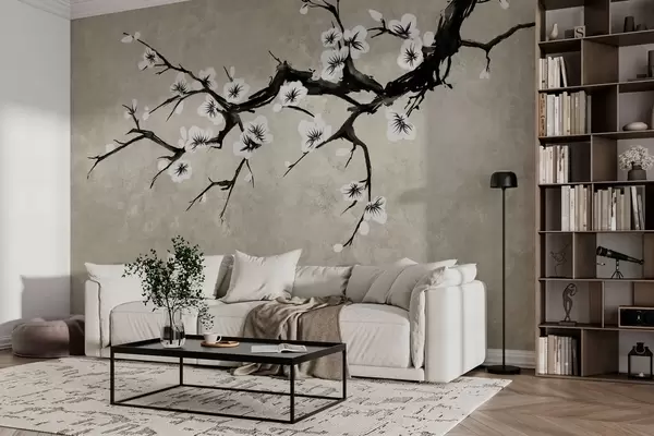 Fototapetak Fehér virágokkal díszített ág minimalista stílusban Nr. w05425