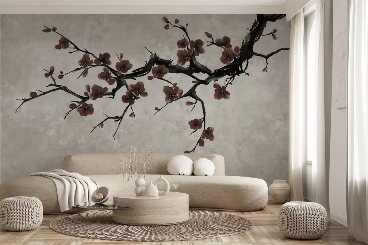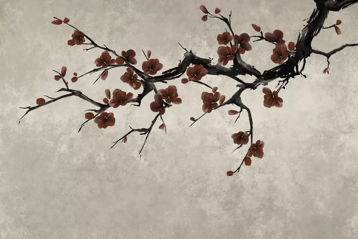 Fototapetak Ág sötétvörös virágokkal semleges háttér előtt Nr. w05425v1