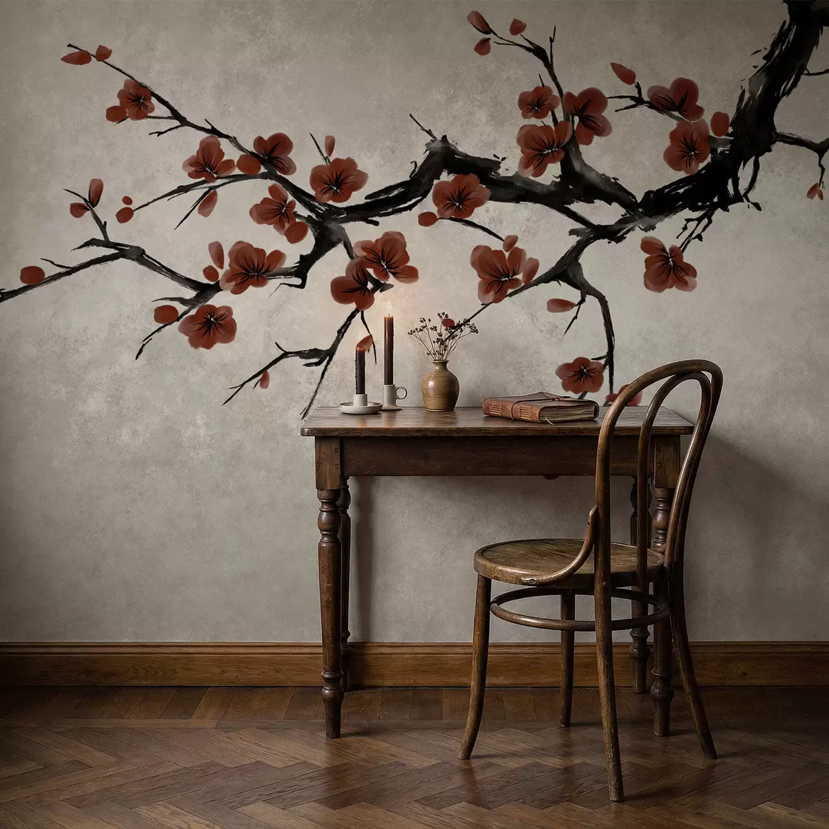 Fototapetak Ág sötétvörös virágokkal semleges háttér előtt Nr. w05425v1
