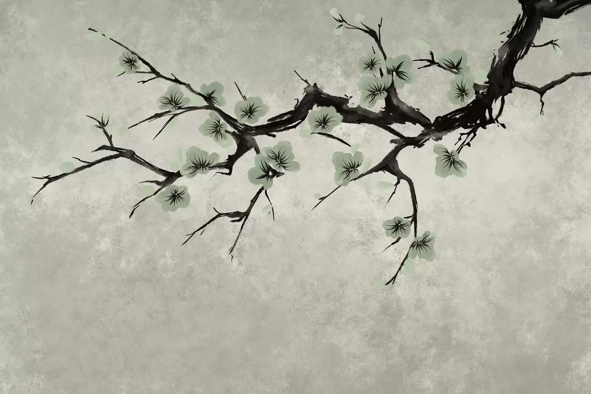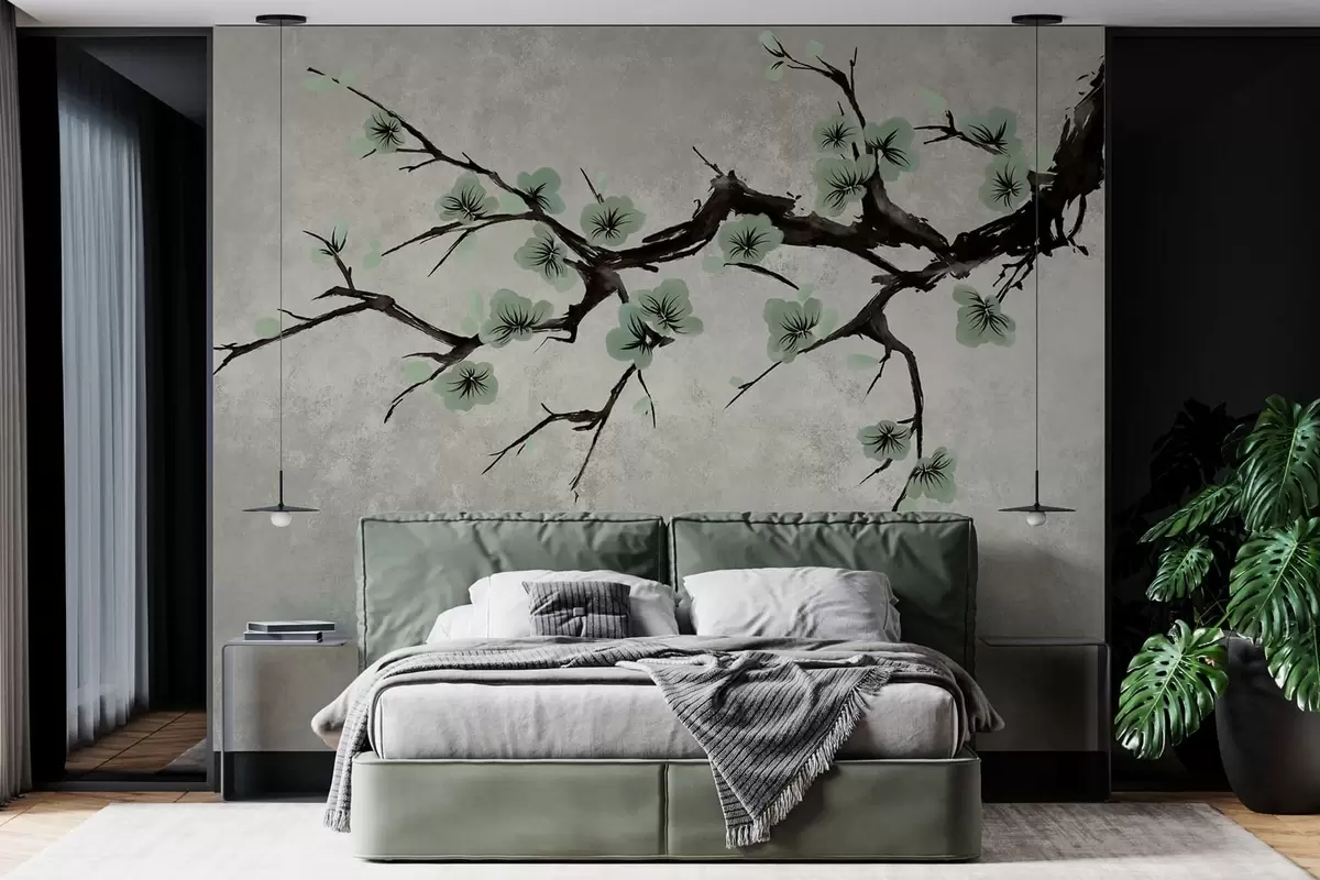 Fototapetak Zöld virágokkal díszített ág, nyugodt színekben Nr. w05425v2