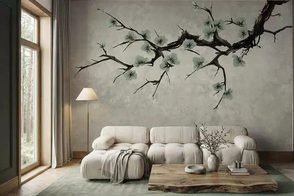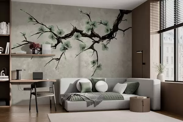 Fototapetak Zöld virágokkal díszített ág, nyugodt színekben Nr. w05425v2