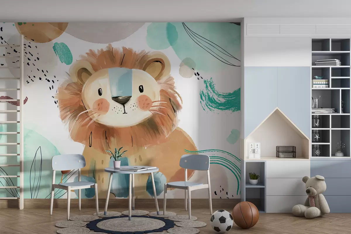 Fototapetak Egy aranyos rajzfilm oroszlán színes, absztrakt háttérrel, ecsetvonásokkal és pasztell színfoltokkal Nr. w07924