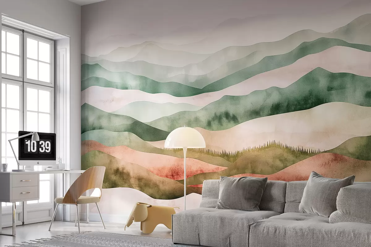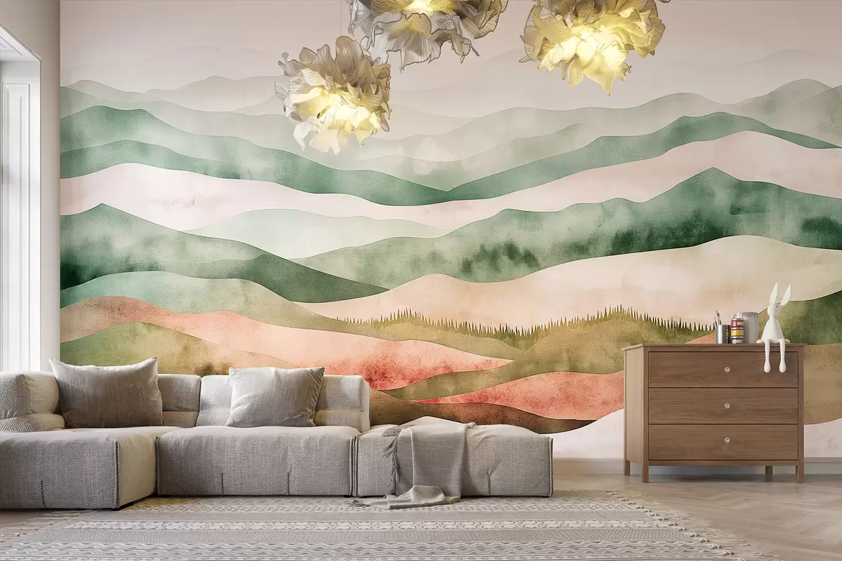 Fototapetak Akvarell hegyek tájak, erdő, természet, zöld és bézs színek Nr. w07950v1