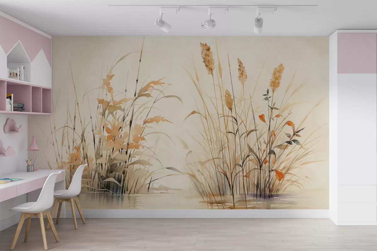 Fototapetak Nád bokrok egy tó textúrájában, akvarell, bézs, narancssárga színű Nr. w07964