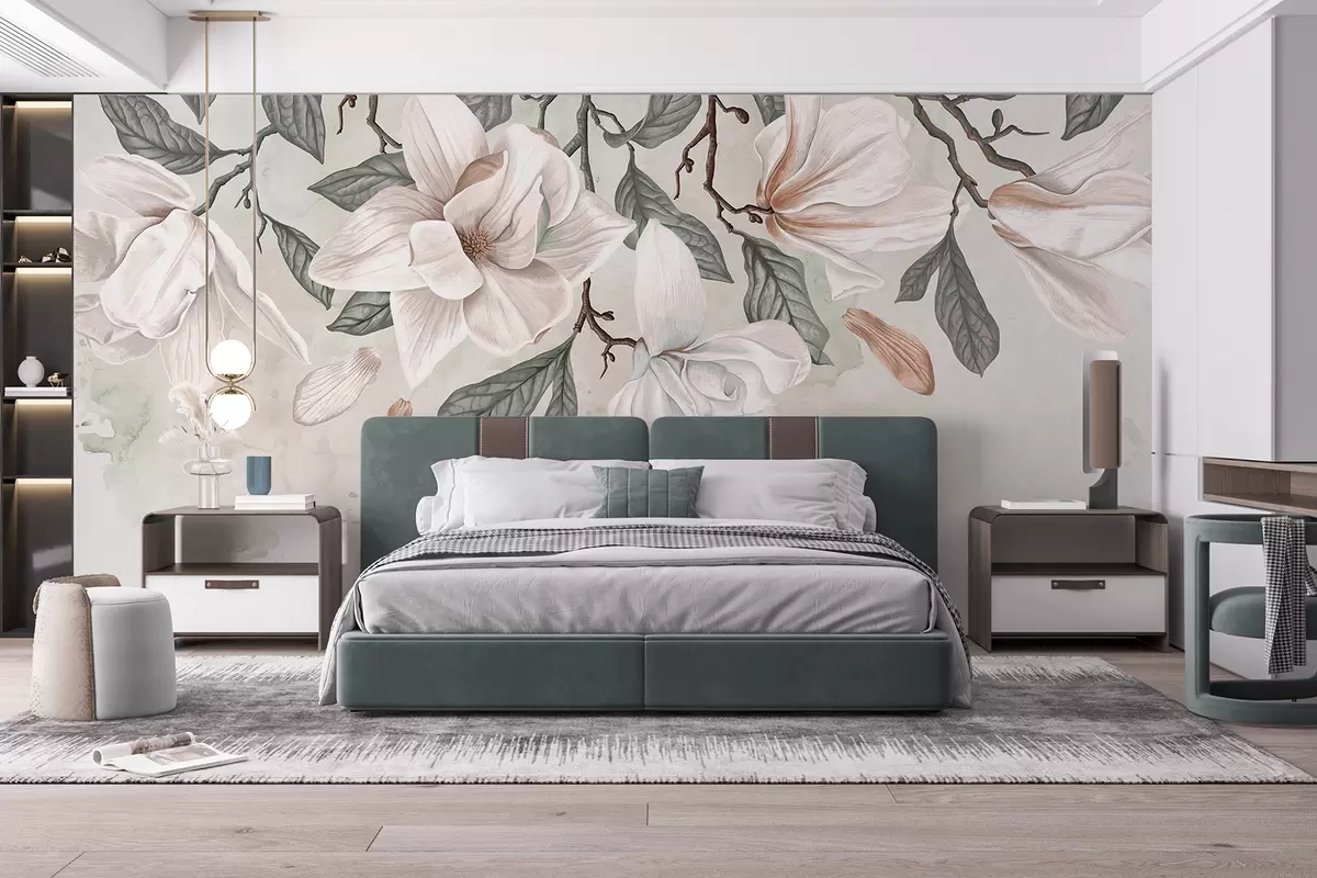 Fototapetak Finom rózsaszín és fehér magnólia virágok zöld levelekkel világos alapon, lágy, virágos kompozíció Nr. w07977