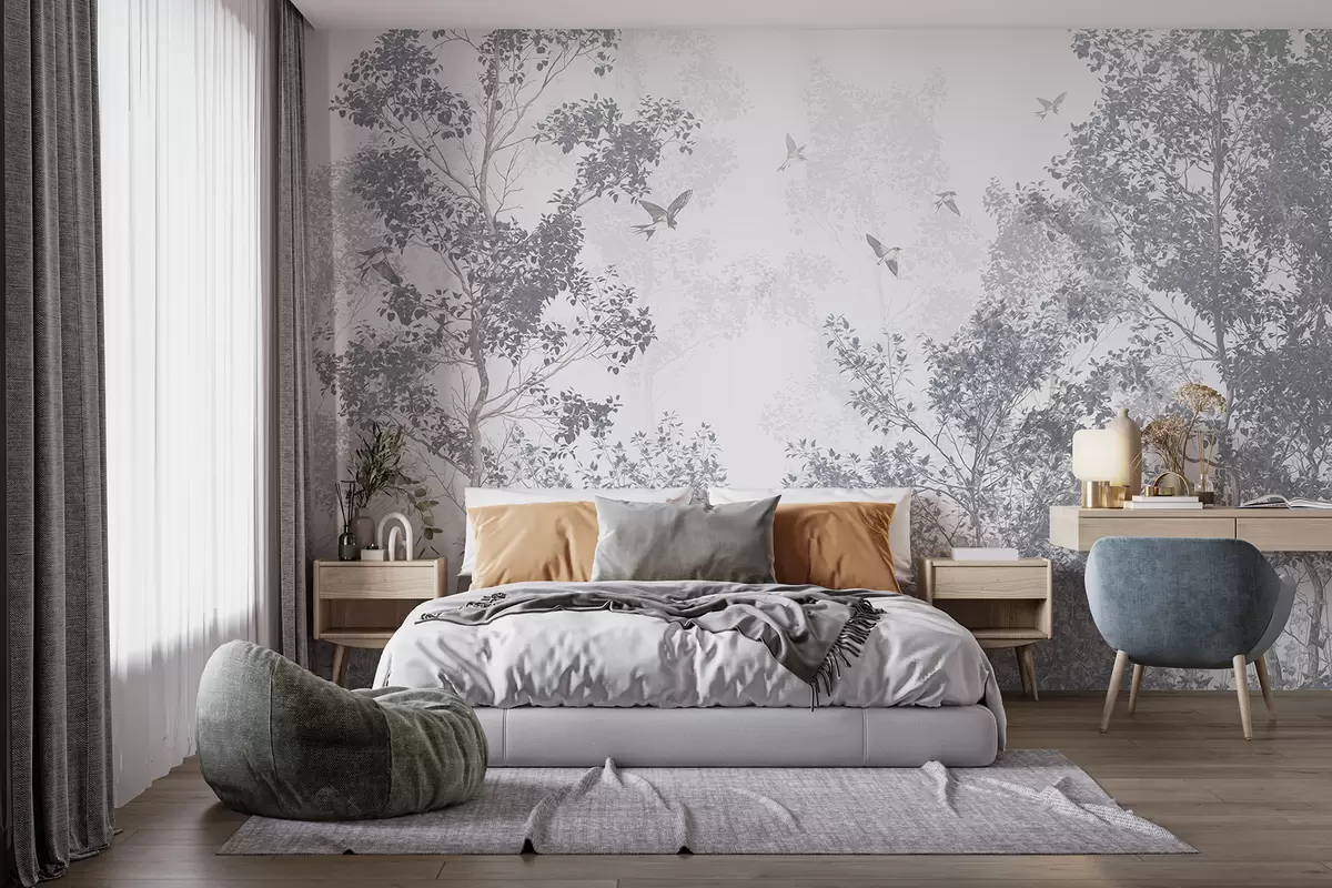 Fototapetak Fák szürke levelekkel és ágakkal, az égen repülő madarakkal, fehér háttérrel Nr. w07982v1