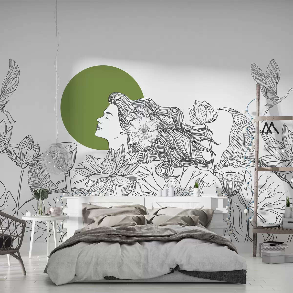 Fototapetak Nő a természetben, vonalas rajz, lótuszvirág, nagy levelek, repülő madarak, szürke és zöld színben Nr. w07988v3