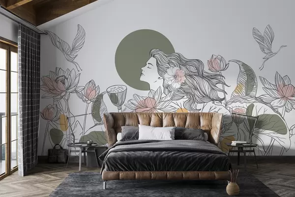Fototapetak Nő a természetben, vonalas rajz, lótuszvirág, nagy levelek, repülő madarak, pasztell színek Nr. w07988v6