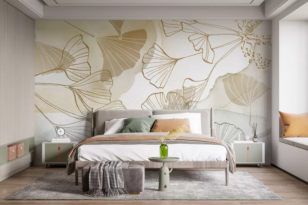 Fototapetak Finom ginkgo levelek mintája bézs, barna és kék árnyalatokban világos háttér előtt Nr. w08157