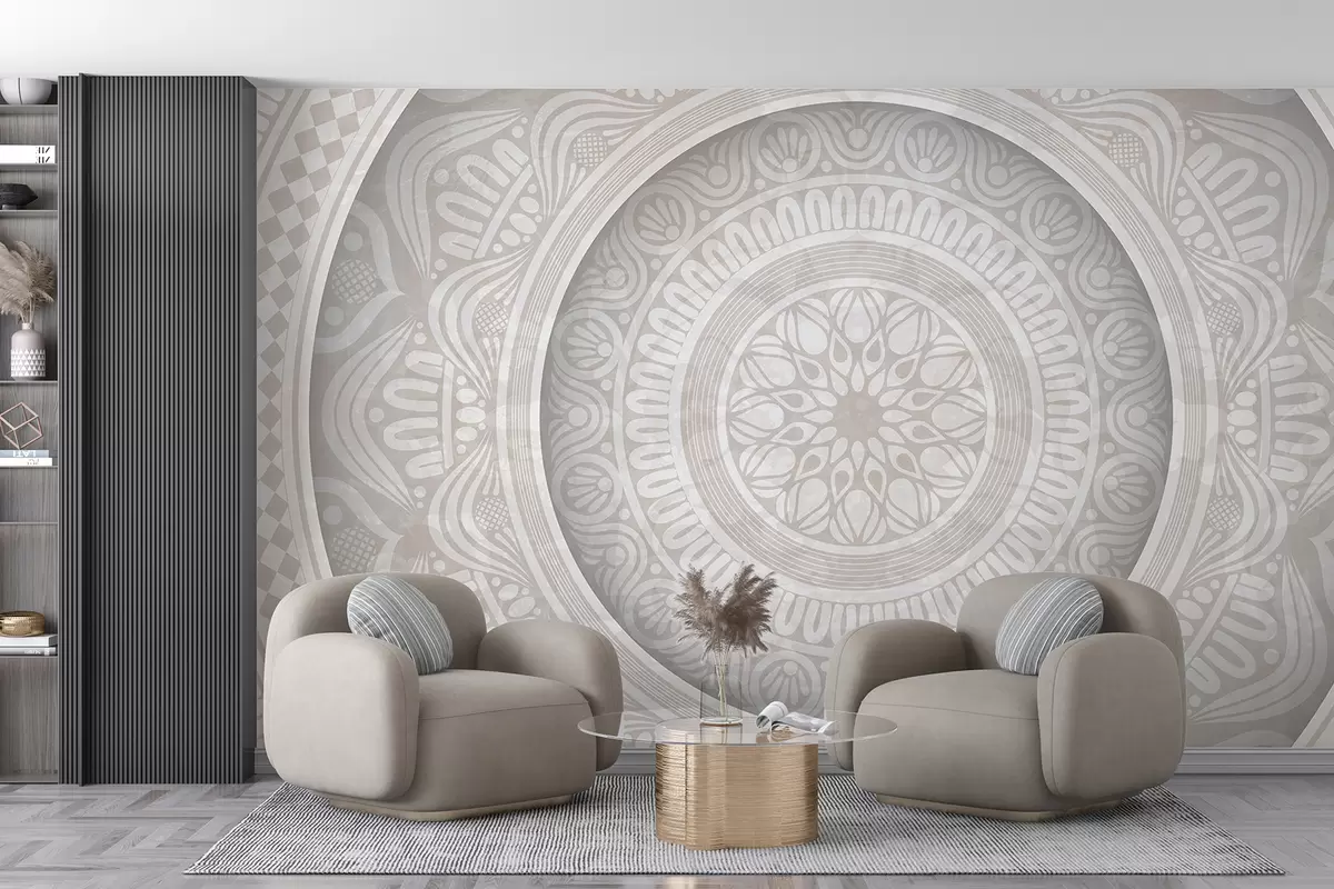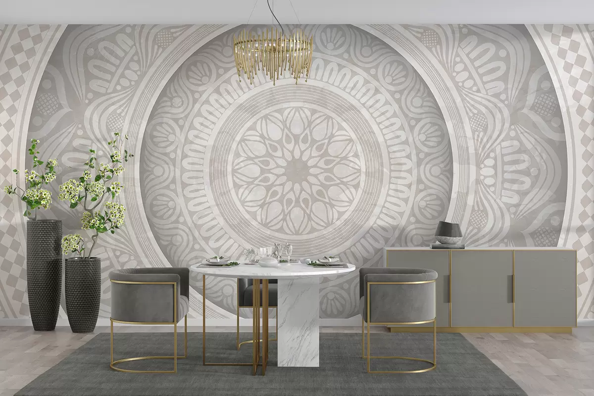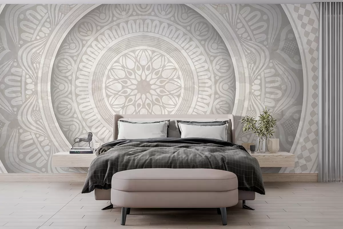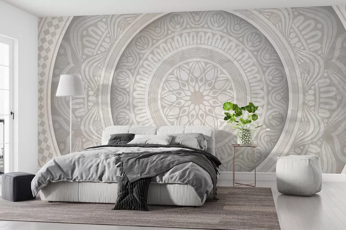 Fototapetak Részletes szimmetrikus szürke-fehér mandalanyomat koncentrikus körökkel és geometriai alakzatokkal Nr. w08182