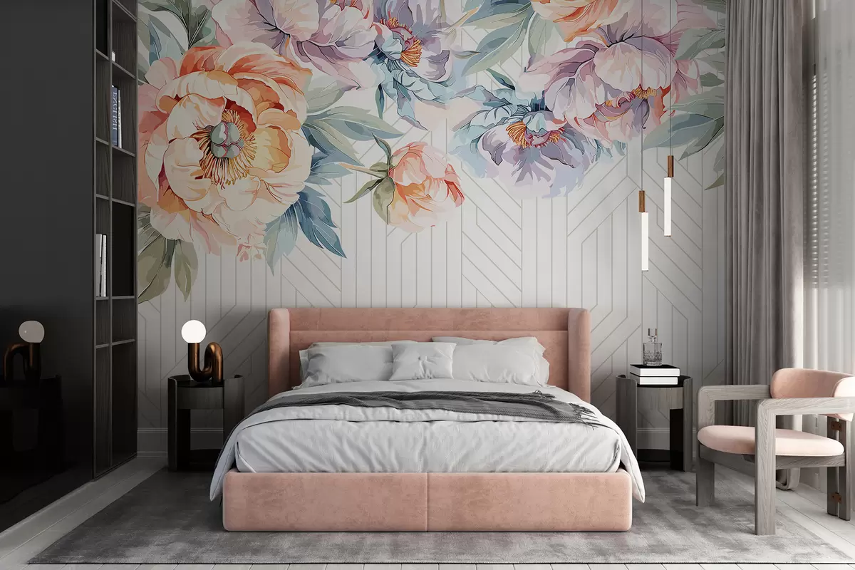 Fototapetak Élénk őszibarack és rózsaszín absztrakt pünkösdi rózsa zöld levelekkel, fehér és szürke mintás háttérrel Nr. w08183