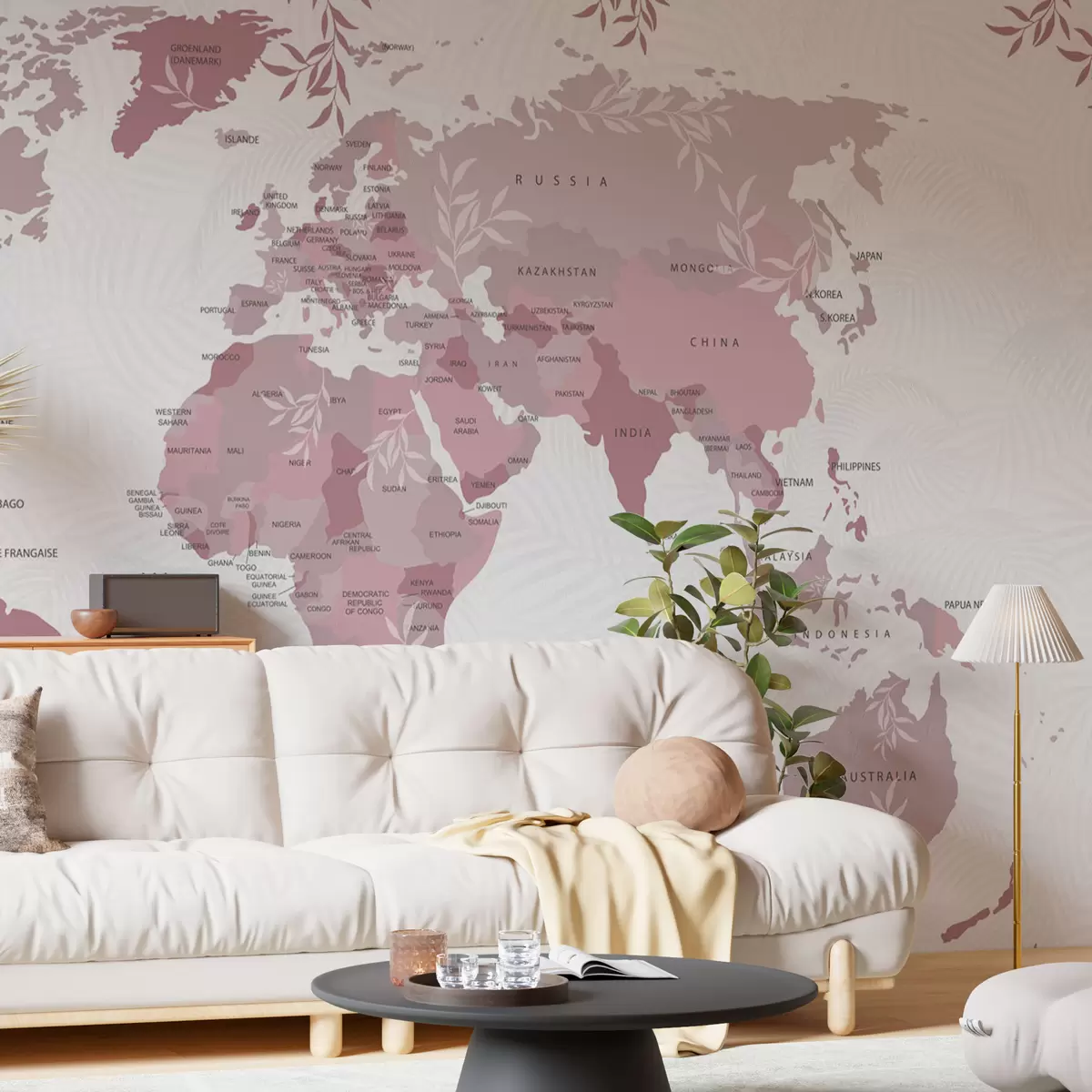 Fototapetak Stílusos világtérkép rózsaszín levelekkel és növényekkel Nr. w08211v3