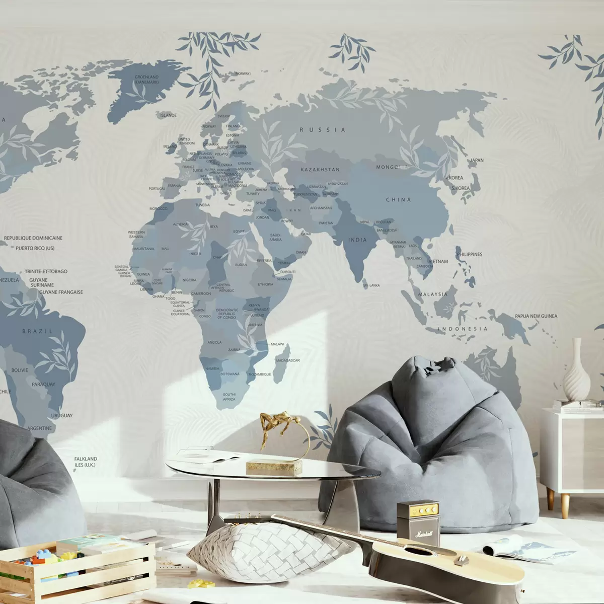 Fototapetak Stílusos világtérkép kék színű levelekkel és növényekkel Nr. w08211v4