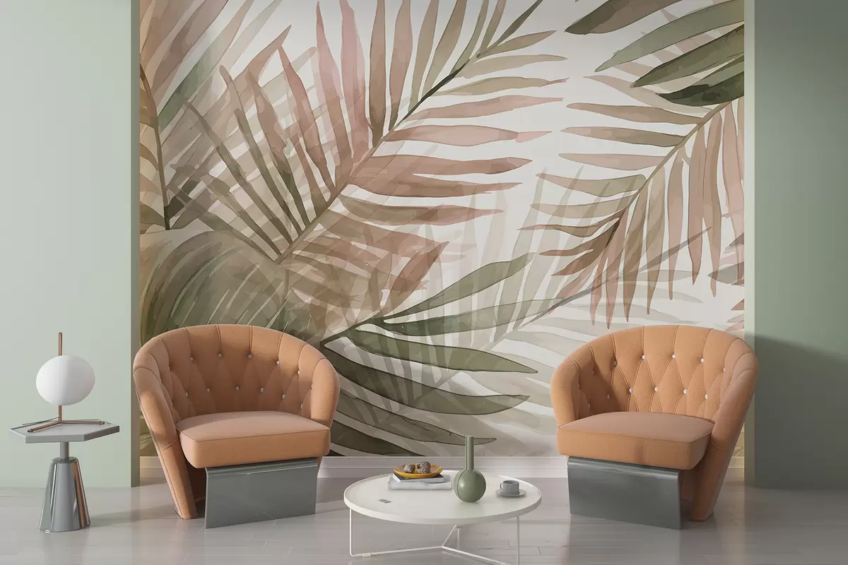 Fototapetak Pálma akvarell levelek a zöld és rózsaszín különböző árnyalataiban világos háttér előtt Nr. w08218