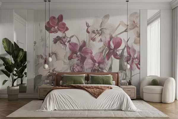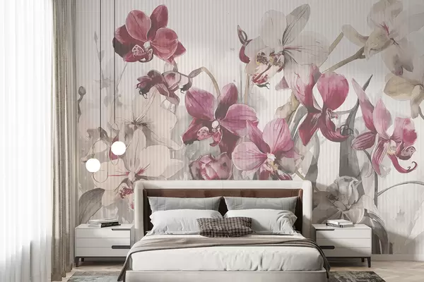 Fototapetak Élénk rózsaszín és fehér orchidea virágok világos akvarell textúrájú háttér előtt Nr. w08225