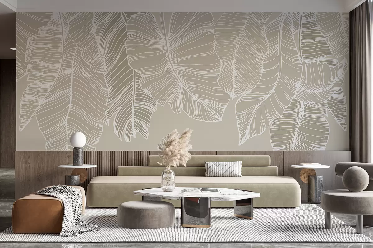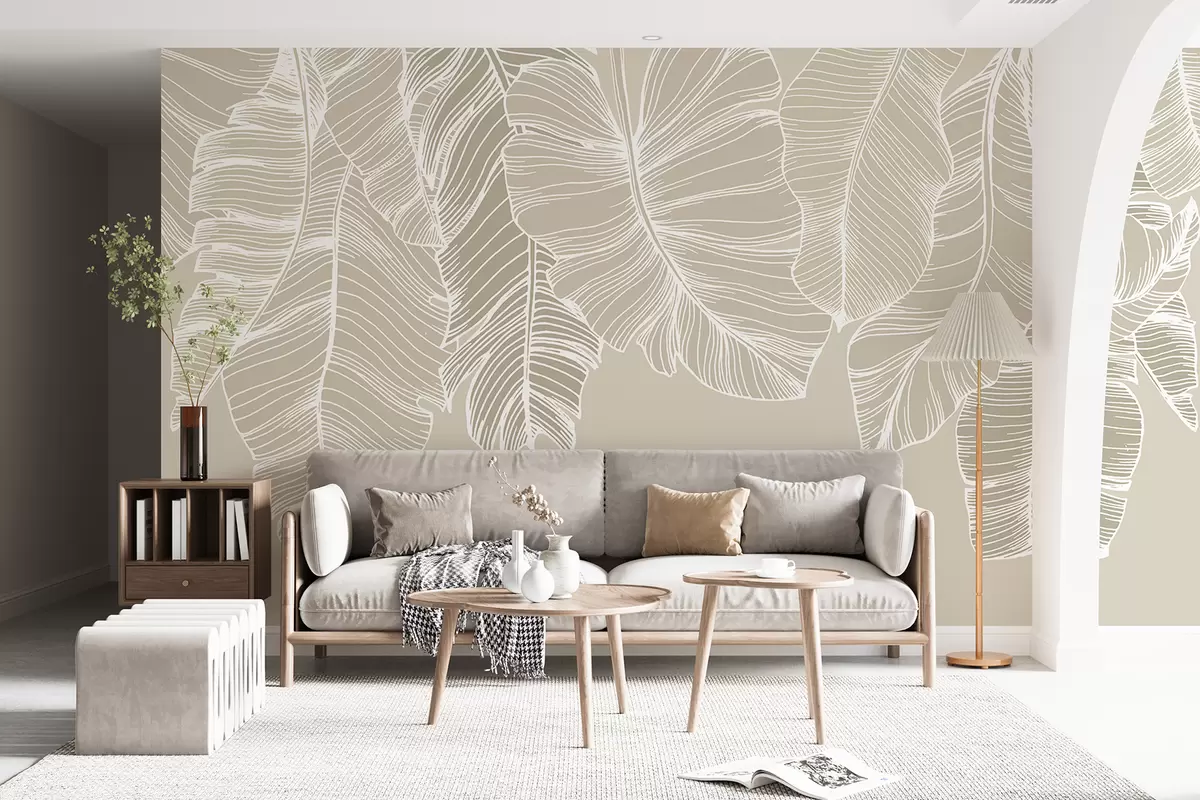 Fototapetak Fehér trópusi virágos levelek világos bézs háttérrel, minimalista vonalas designnal Nr. w08235