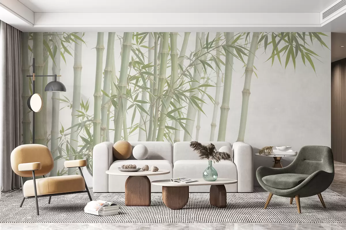 Fototapetak Sűrű bambusz erdő, magas bambuszszárral és zöld levelekkel puha, homályos háttér előtt Nr. w08237