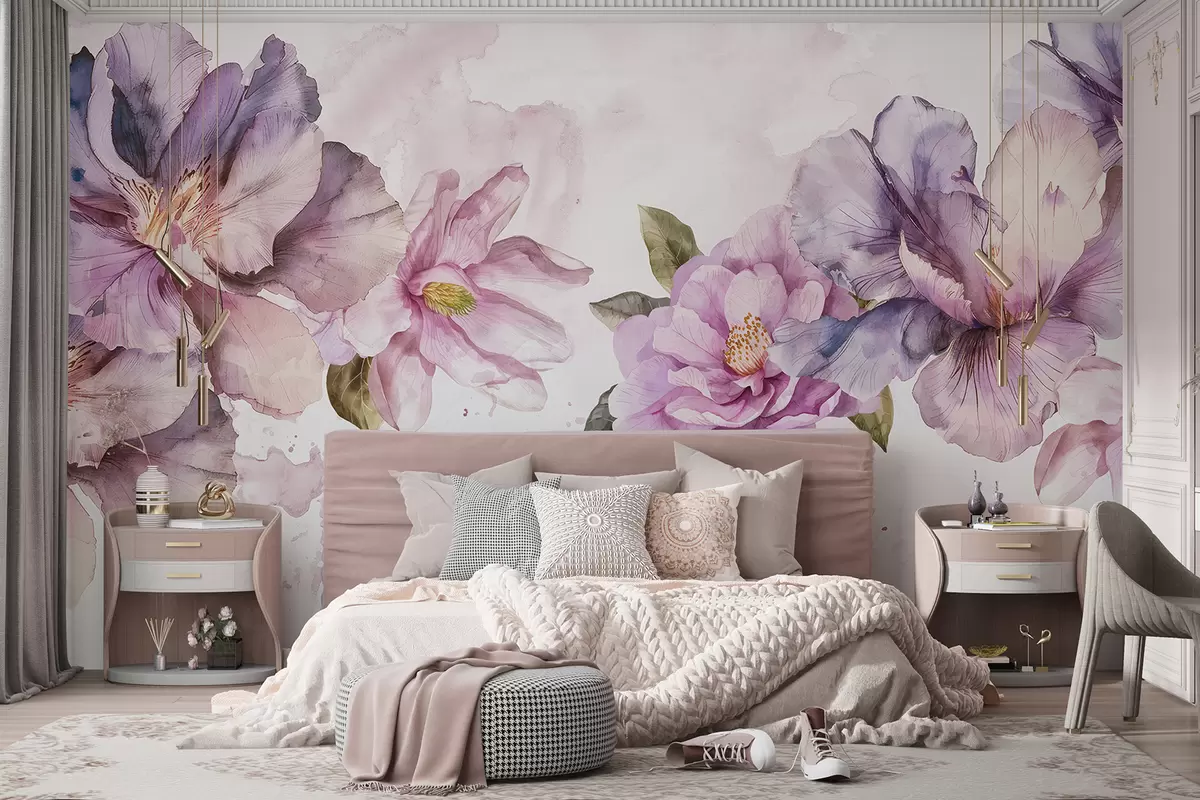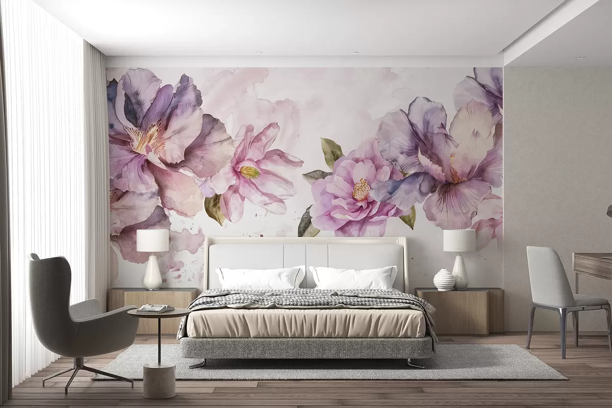 Fototapetak Finom rózsaszín és lila akvarell virágok puha szirmokkal és zöld levelekkel világos háttér előtt Nr. w08238