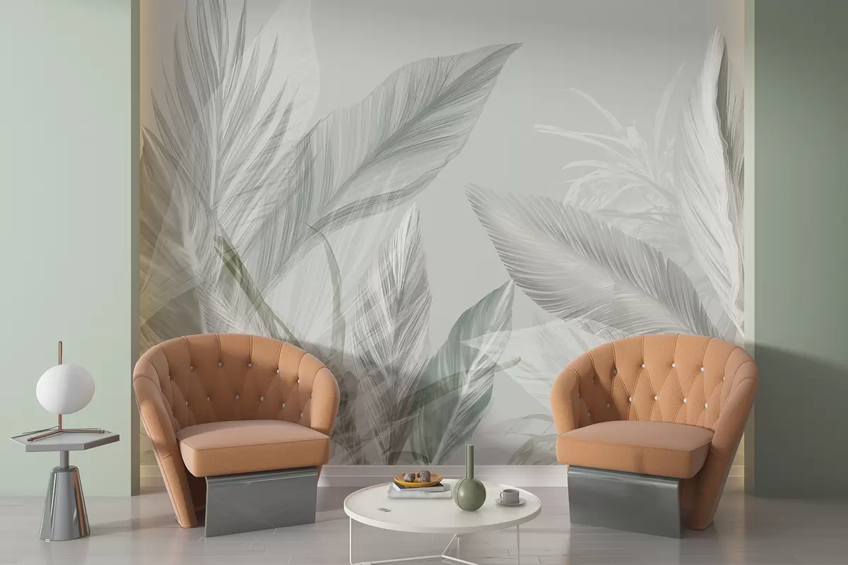 Fototapetak Puha fehér, zöld és szürke tollak és trópusi levelek lebegnek a világos háttér előtt Nr. w08241
