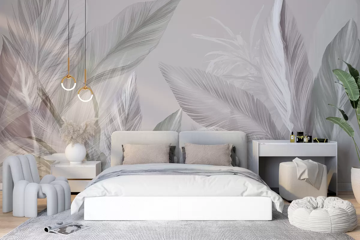 Fototapetak Puha fehér, rózsaszín és szürke tollak és világos háttér előtt lebegő trópusi levelek Nr. w08241v1