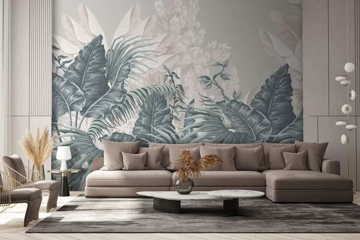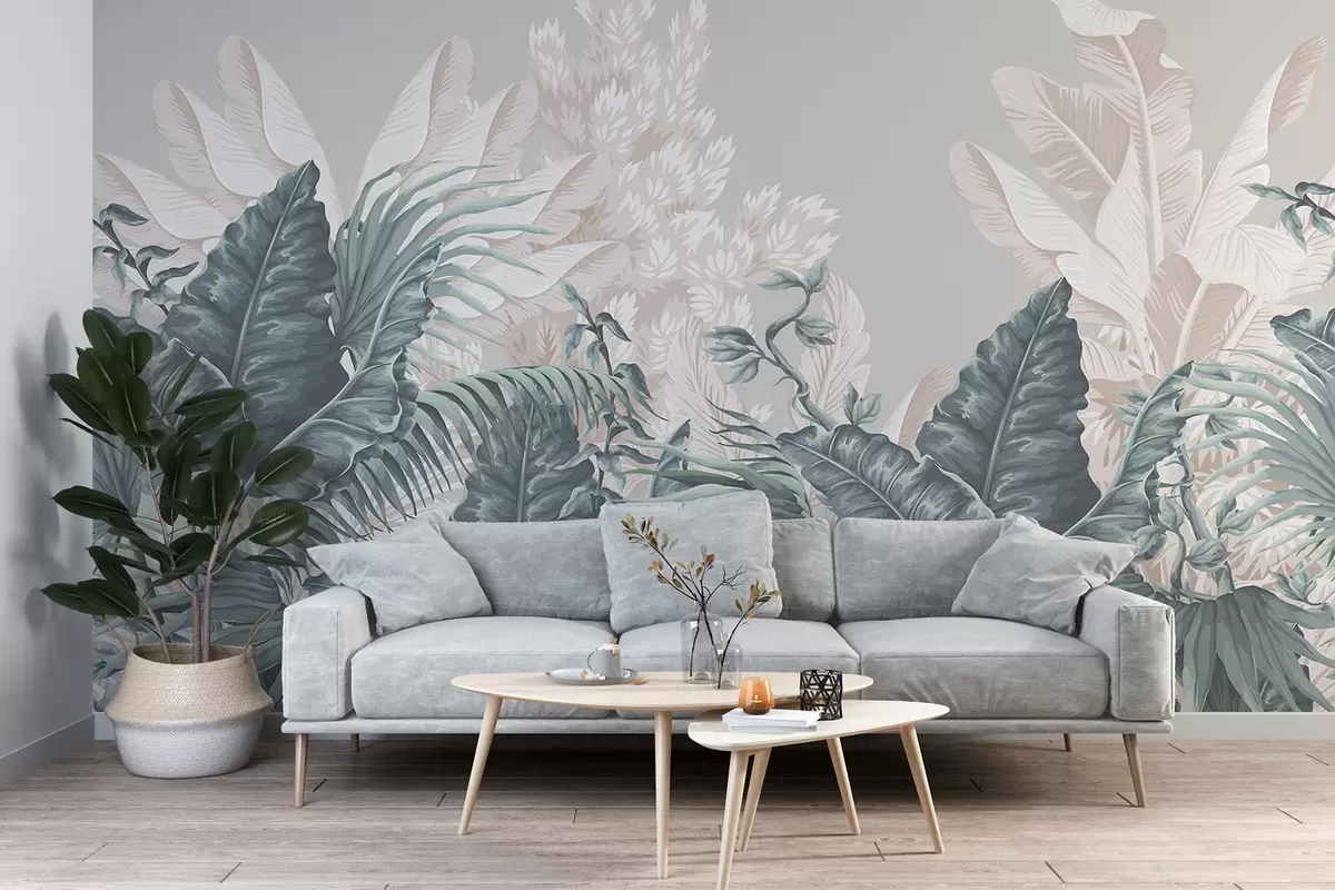 Fototapetak Trópusi dzsungel jelenet nagy zöld levelekkel és virágokkal az előtérben, buja hangulatot teremtve Nr. w08242