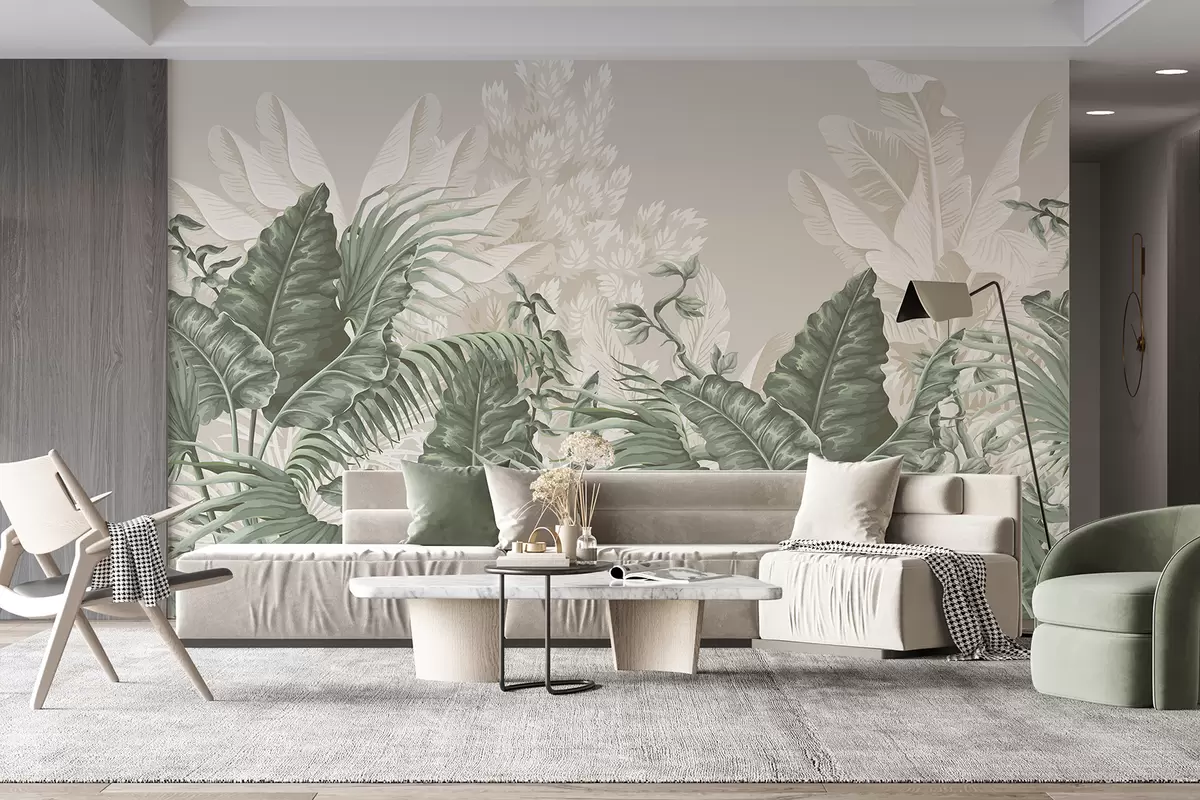 Fototapetak Trópusi dzsungel jelenet nagy zöld levelekkel és virágokkal az előtérben, buja hangulatot teremtve Nr. w08242v1