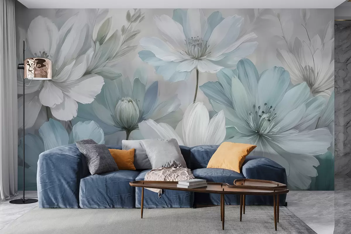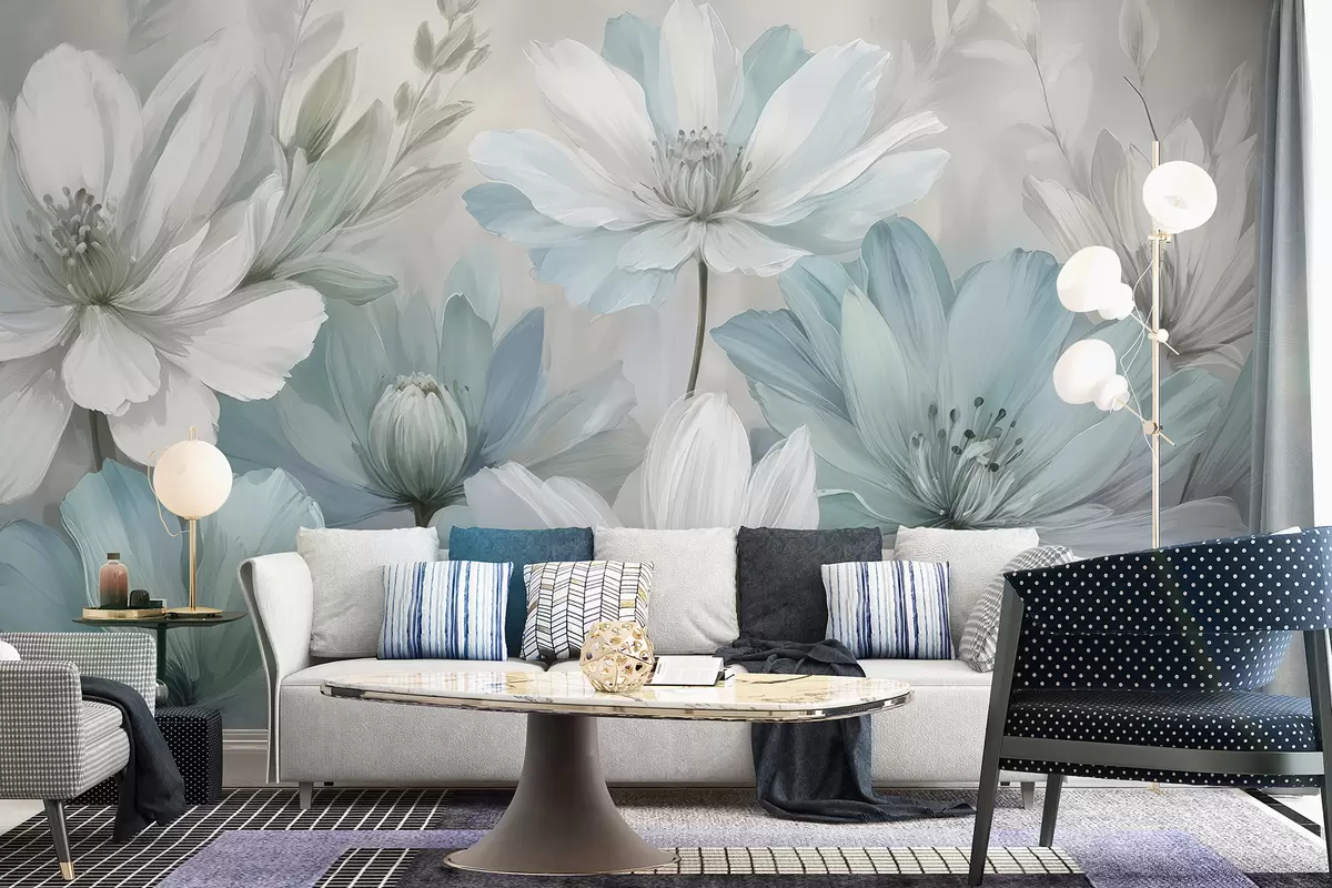 Fototapetak Közeli kép fehér és világoskék százszorszépszerű virágokról, amelyek lágy, elmosódott hátterű művészetet festenek Nr. w08247