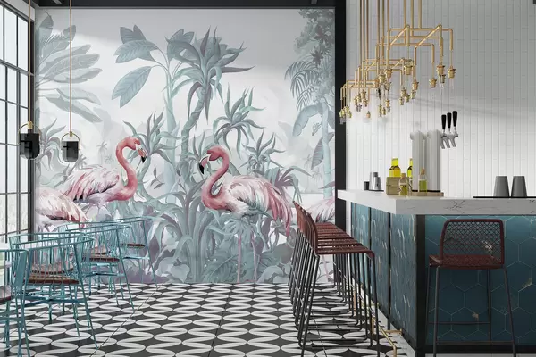 Fototapetak Rózsaszín flamingók állnak egy buja, trópusi lombozatban, nagy pálmalevelekkel és zöld és fehér árnyalatú virágokkal Nr. w08250v1