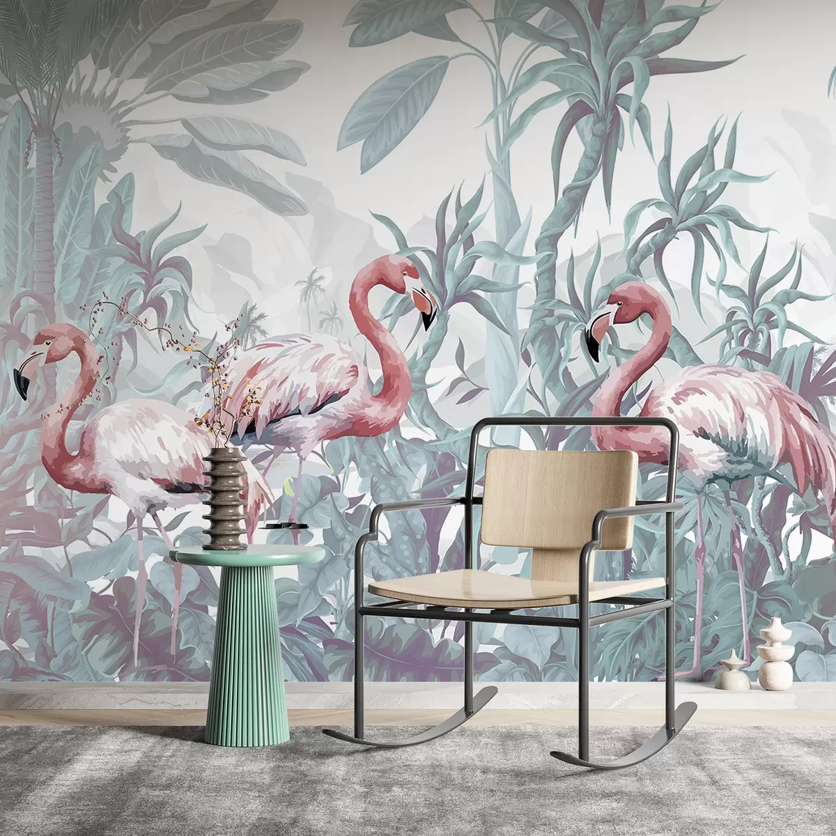 Fototapetak Rózsaszín flamingók állnak egy buja, trópusi lombozatban, nagy pálmalevelekkel és zöld és fehér árnyalatú virágokkal Nr. w08250v1