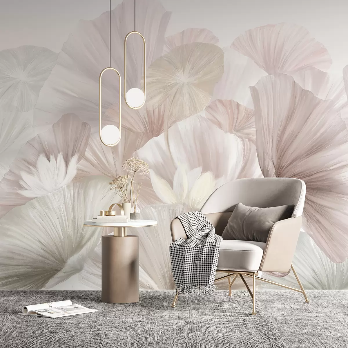 Fototapetak Finom rózsaszín lótuszlevelek fehér virágokkal, puha, tollas szirmokkal, természetes művészeti kompozícióban elrendezve Nr. w08265v1