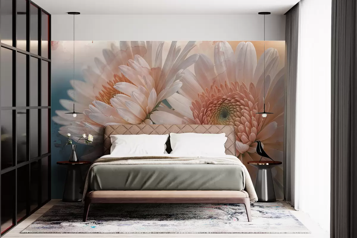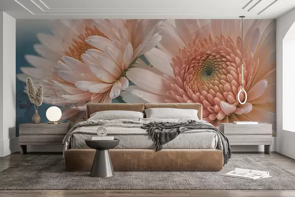 Fototapetak Lágy rózsaszín gerbera százszorszép virágok finom szirmokkal és textúrával világoskék háttér előtt Nr. w08272