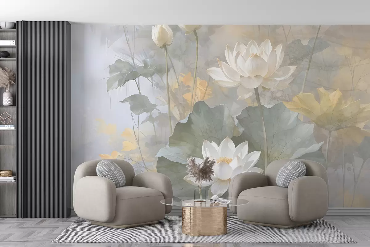 Fototapetak Fehér lótuszvirágok levelekkel egy tóban, lágy, elmosódott sárga és zöld háttérrel Nr. w08275