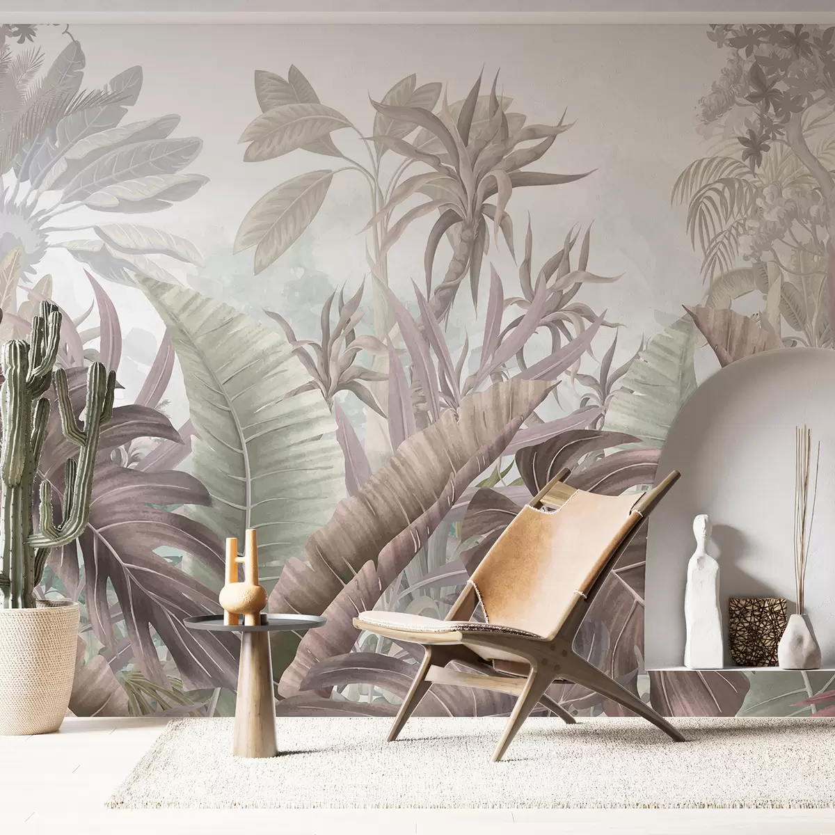 Fototapetak Trópusi dzsungel nagy pálmalevelekkel és egzotikus növényekkel a szürke, fehér és bézs árnyalataiban Nr. w08307