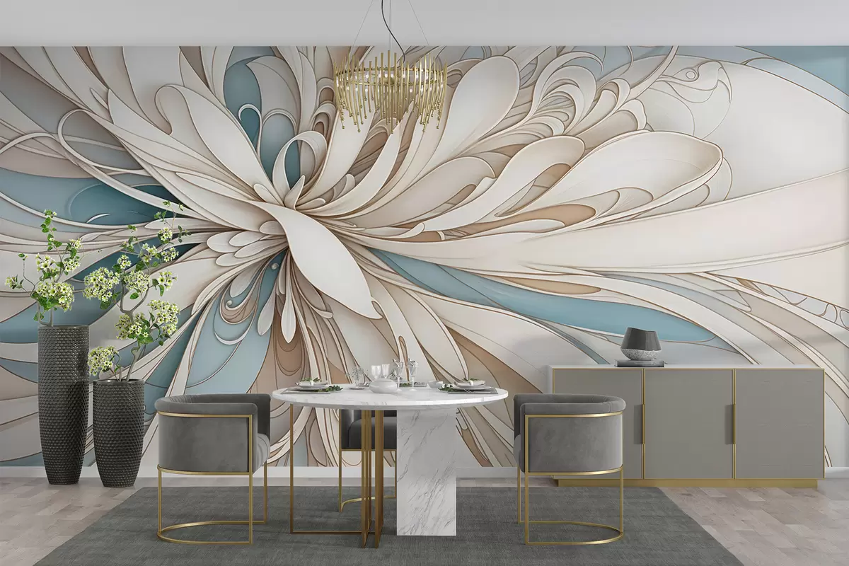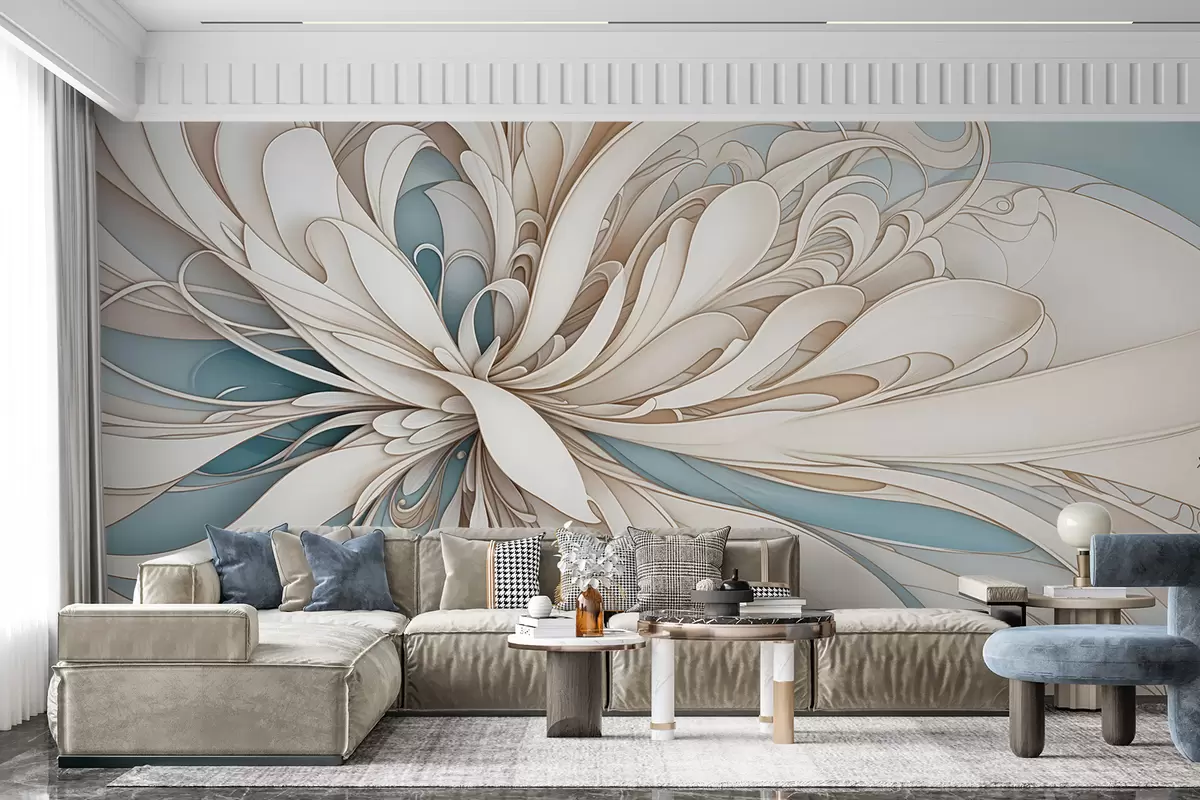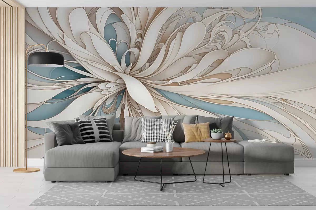 Fototapetak Absztrakt virágminta kavargó, organikus formákkal, bézs, barnásbarna és kék árnyalatokkal, világos háttérrel Nr. w08311