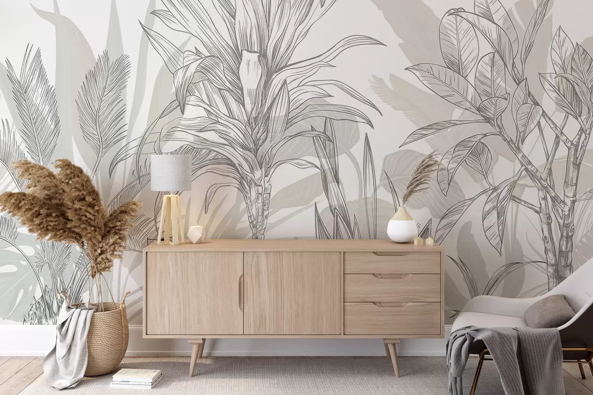 Fototapetak Trópusi grafikus növények nagy, buja levelekkel és virágokkal a szürke és a fehér árnyalataiban, virágos zöld sziluettekkel Nr. w08327