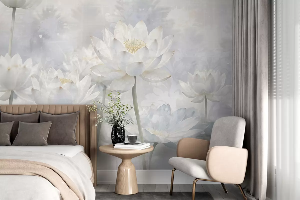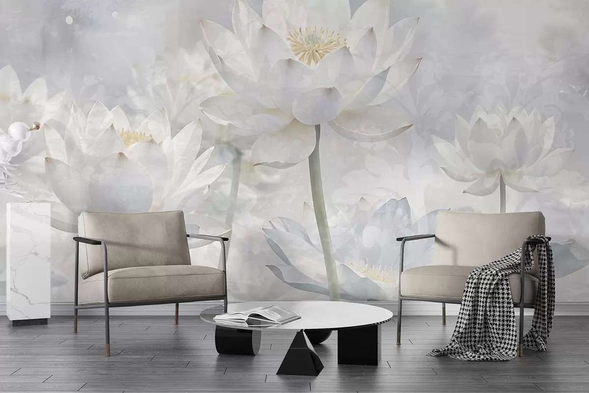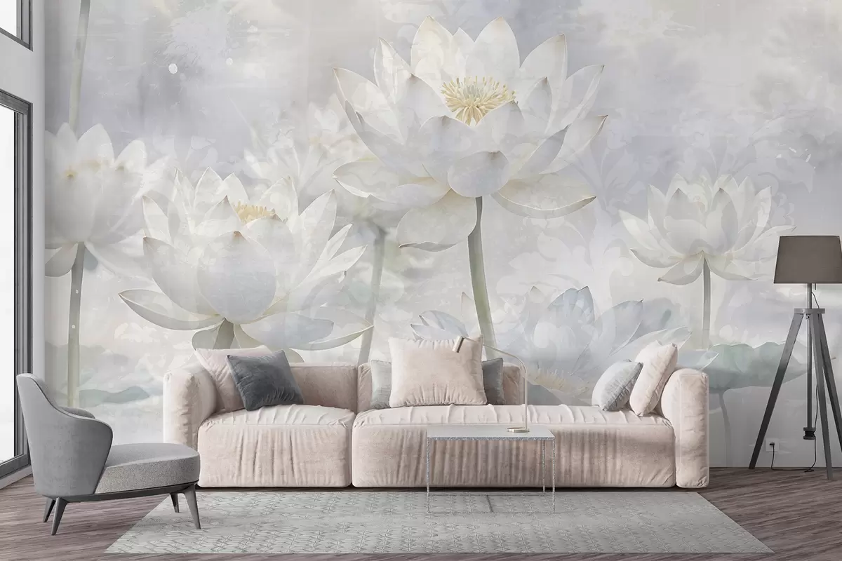 Fototapetak Fehér lótuszvirágok ködös, éteri absztrakt pasztell tájképi háttérben Nr. w08328