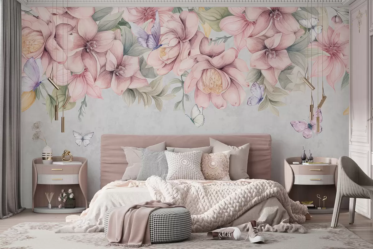 Fototapetak Lágy rózsaszín és fehér virágos, finom virágokkal és levelekkel, texturált szürke háttérrel Nr. w08331
