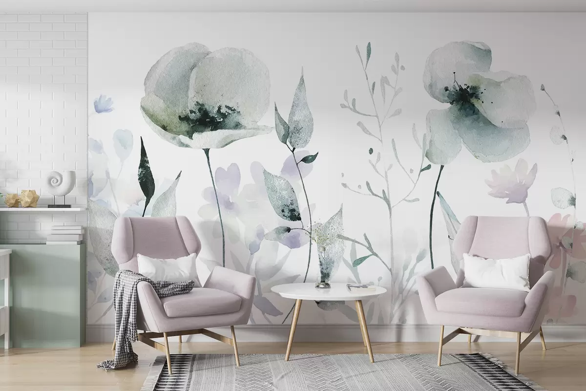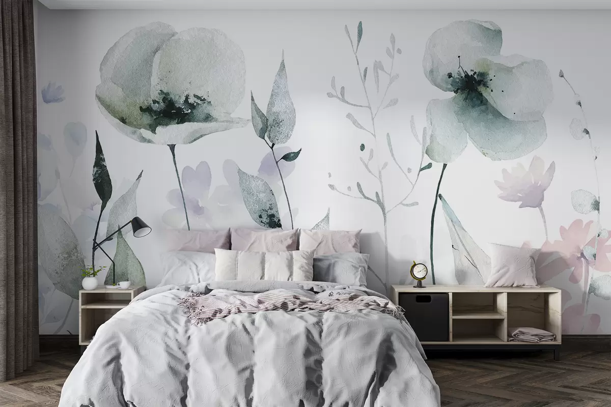Fototapetak Pasztell akvarell virágok finom szirmokkal és levelekkel, a szürke, a fehér és a világos rózsaszín árnyalataiban, fehér háttéren Nr. w08332
