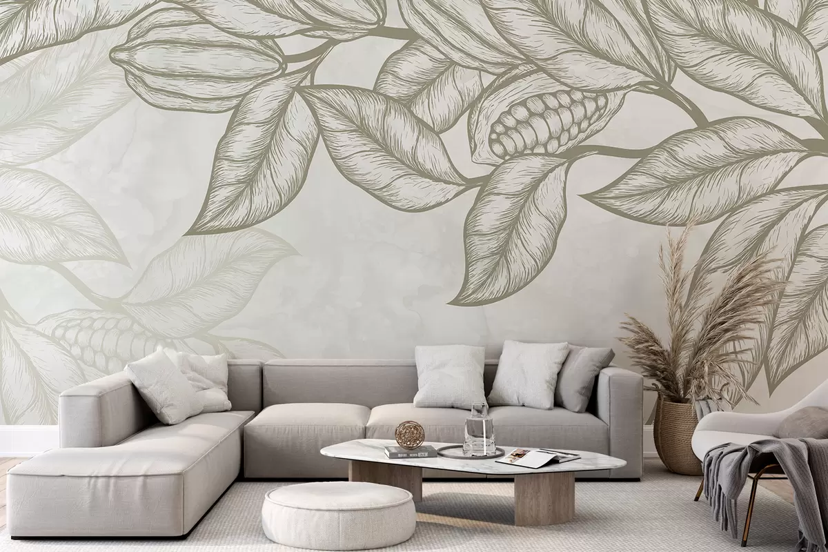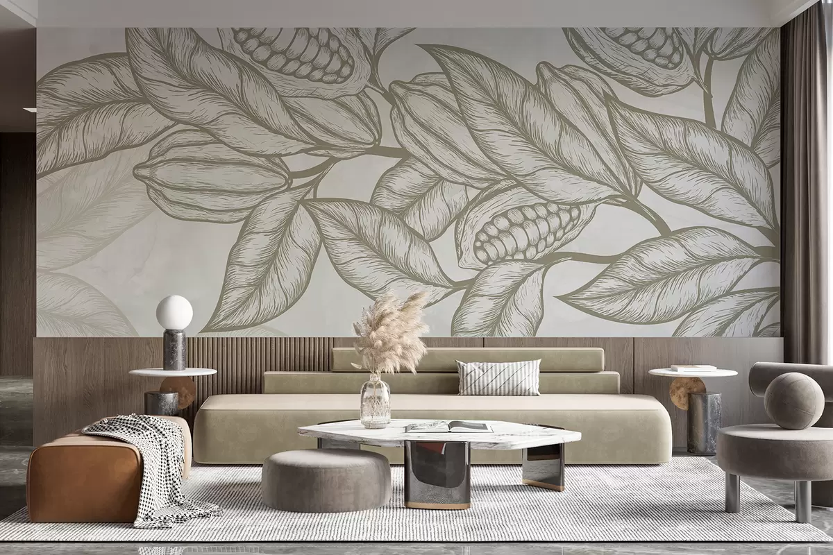 Fototapetak Kakaólevelek és lombozat részletes vonalas rajza természetes, organikus nyomtatásban Nr. w08334