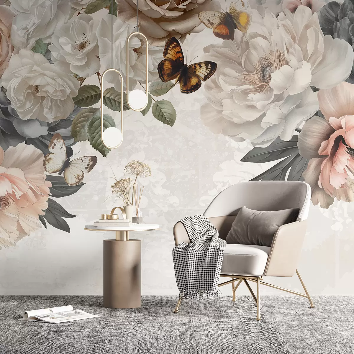 Fototapetak Nagy fehér és rózsaszín pünkösdi rózsaszín virágok, az egyik virágon ülő pillangóval, lágy, elmosódott háttéren Nr. w08340