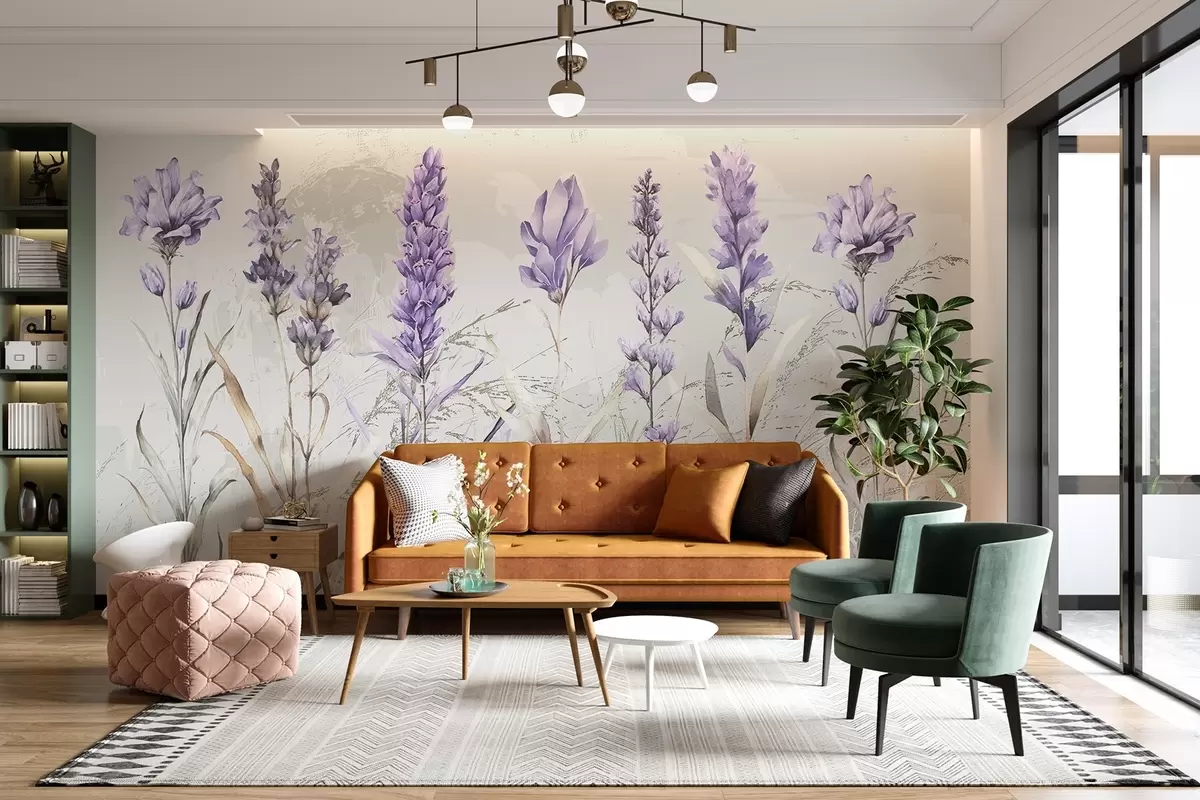 Fototapetak Egy mező lila akvarell levendula virágok lágy, elmosódott textúrájú bézs háttérrel Nr. w08346