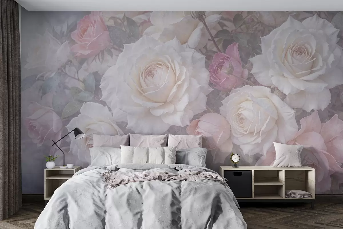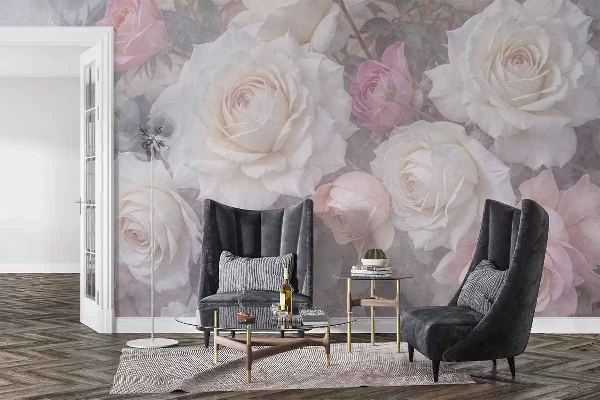 Fototapetak Lágy, pasztellszínű rózsák és bazsarózsák egy elmosódott, ködös szürke textúrájú háttér előtt Nr. w08352