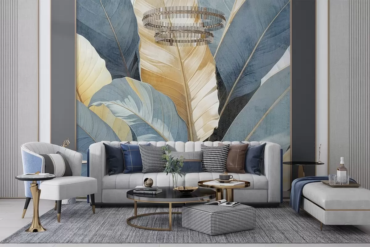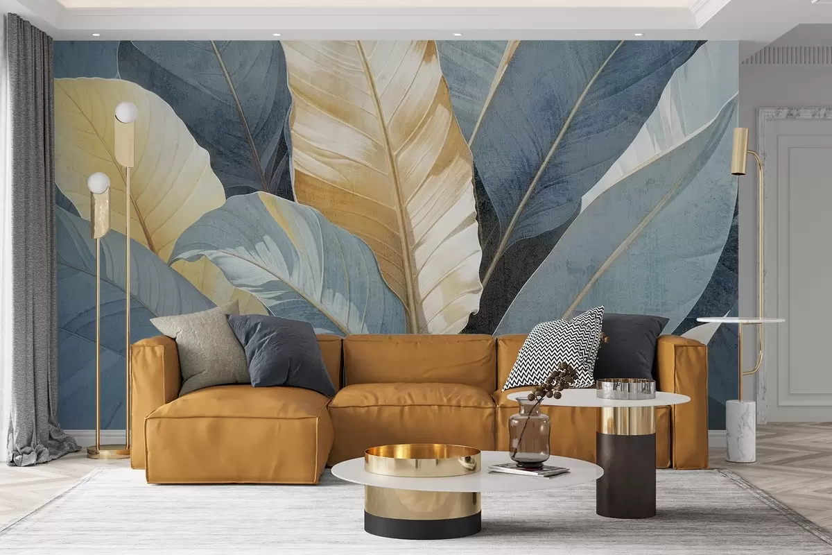 Fototapetak Nagyméretű, dús, textúrált, dekoratív trópusi levelek közeli nézete a kék, zöld és sárga árnyalataiban Nr. w08373