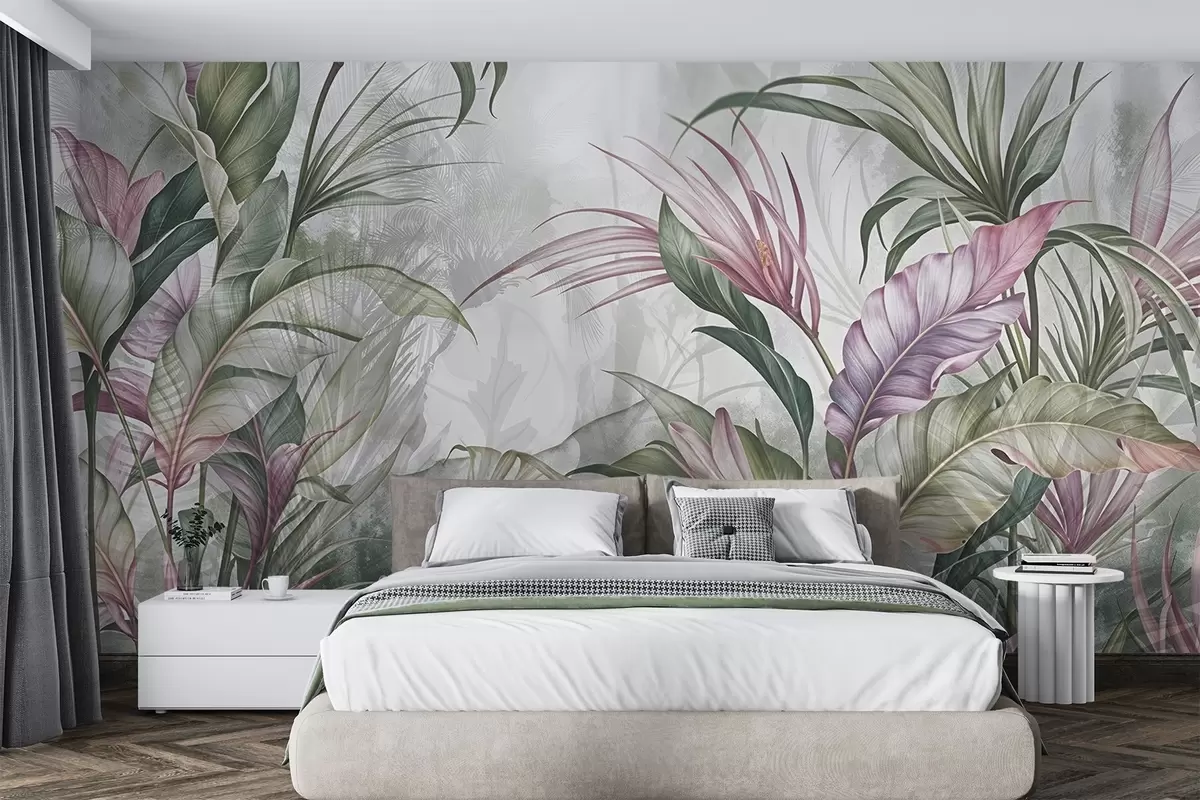 Fototapetak Trópusi dzsungel nagy zöld levelekkel és rózsaszín protea virágokkal, elmosódott textúrájú háttérrel Nr. w08375