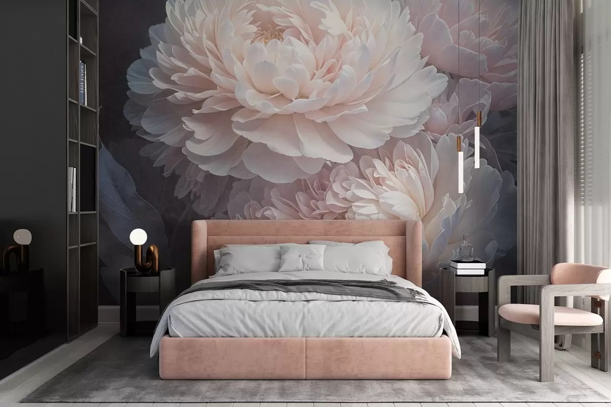 Fototapetak Közelkép két nagy, finom rózsaszínű bazsarózsáról, puha, bolyhos szirmokkal és levelekkel, elmosódott háttér előtt Nr. w08382