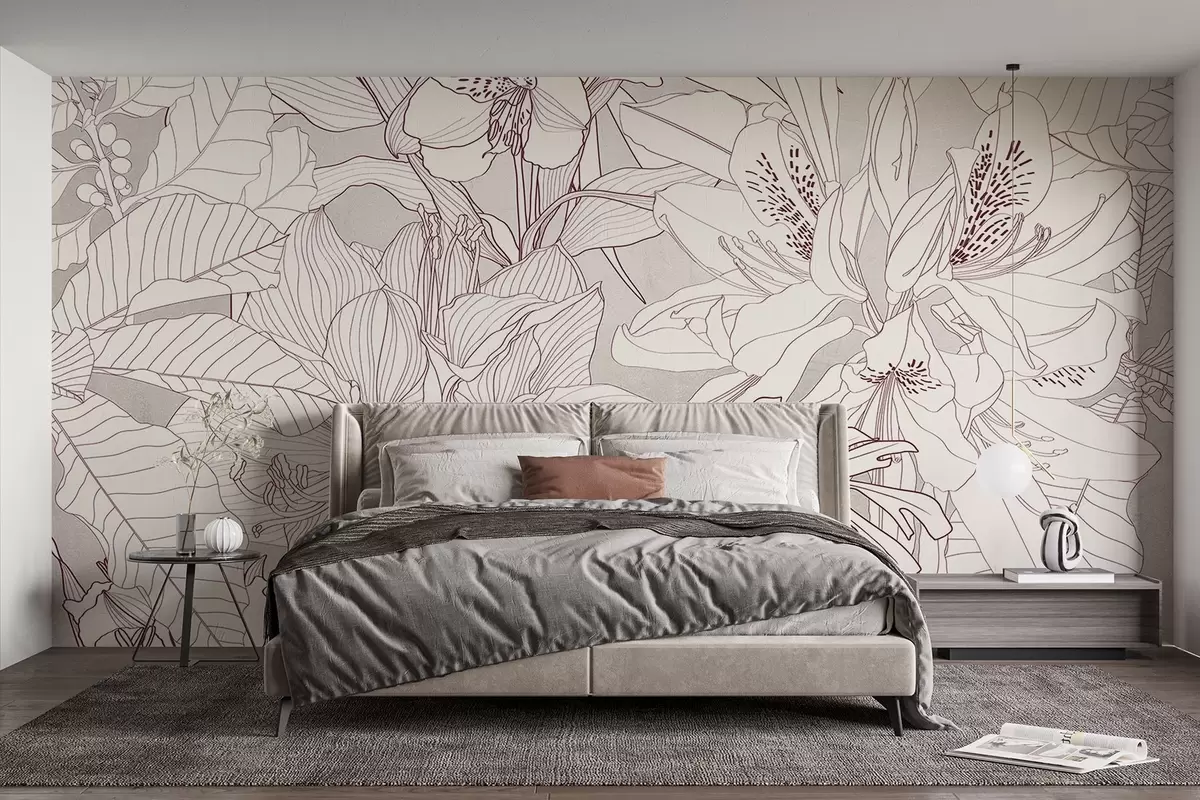 Fototapetak Részletes bordó és szürke virágmintás, különböző típusú virágokkal és levelekkel, buja, bonyolult botanikai mintával Nr. w08385