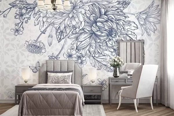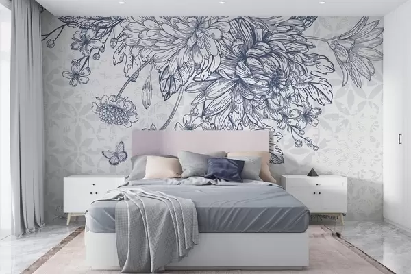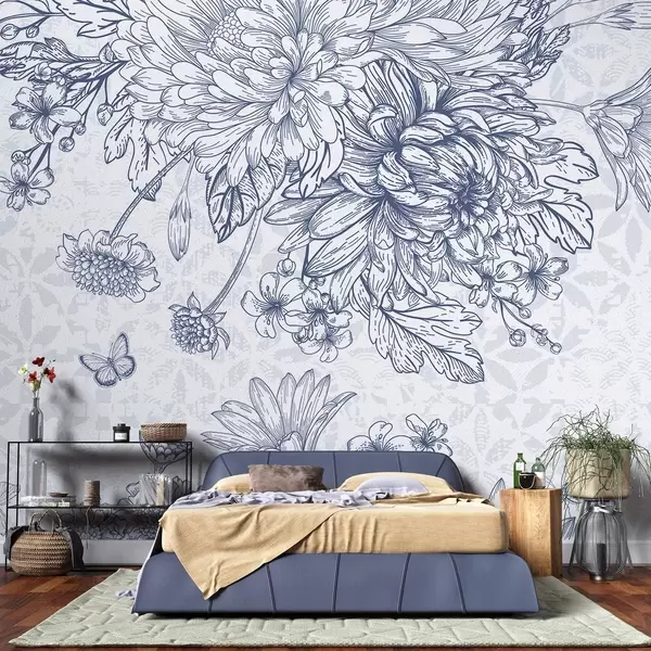 Fototapetak Kék-fehér virágmintás, nagy krizantémvirágokkal, kisebb virágokkal, levelekkel és pillangókkal Nr. w08386