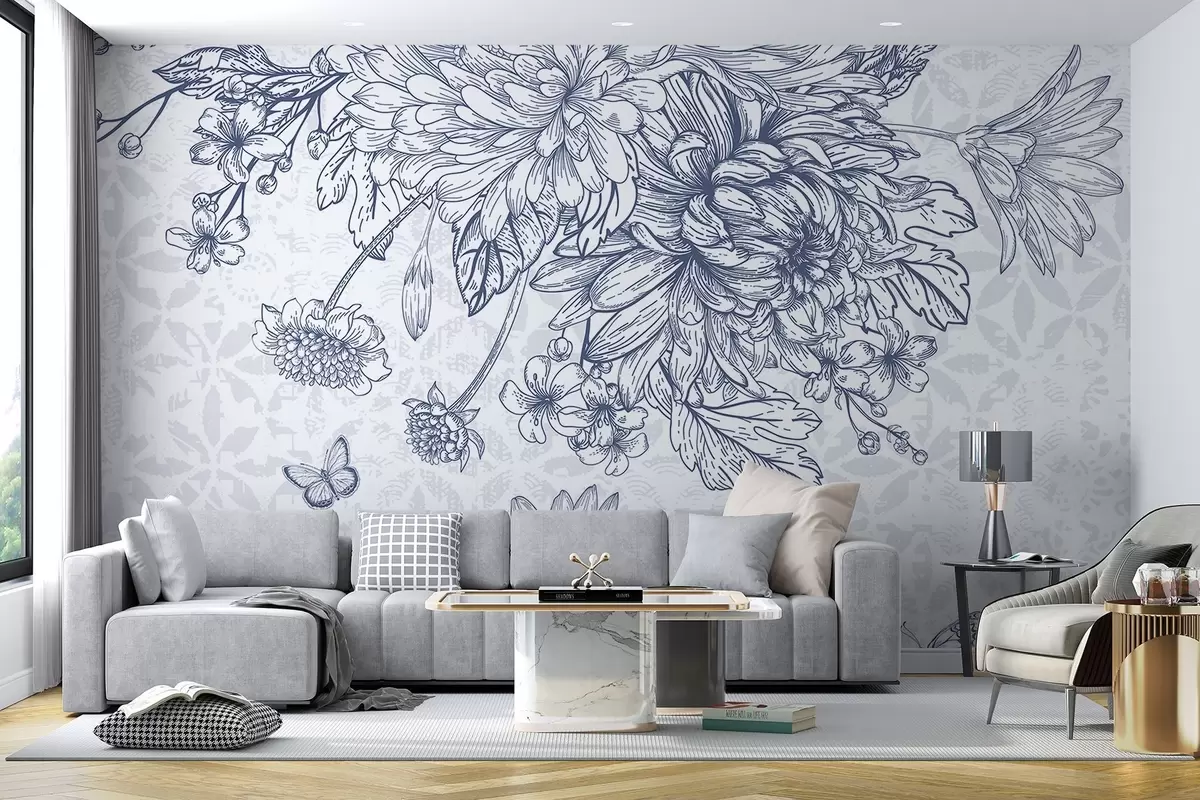 Fototapetak Kék-fehér virágmintás, nagy krizantémvirágokkal, kisebb virágokkal, levelekkel és pillangókkal Nr. w08386