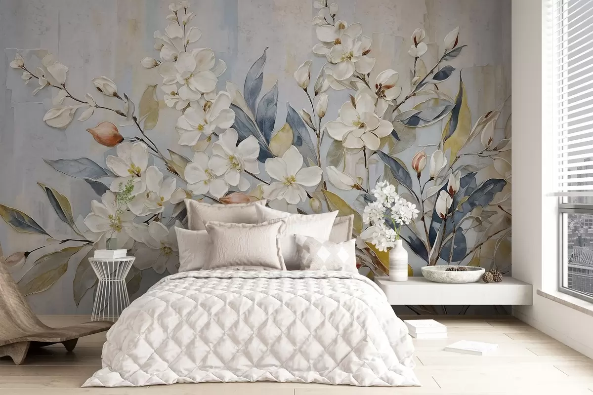 Fototapetak Virágos pasztell finom fehér virágok sárga közepekkel, buja zöld levelekkel és ágakkal körülvéve Nr. w08399v1