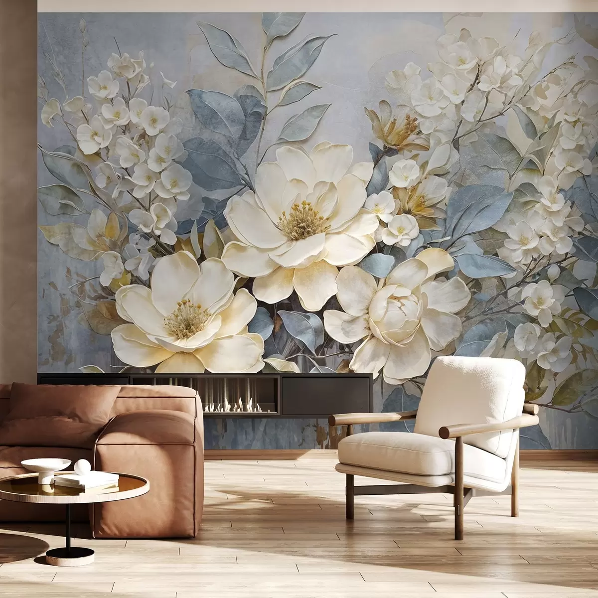 Fototapetak Texturált nagy fehér és halványsárga virágok szürkészöld levelekkel, lágy, elmosódott háttér előtt Nr. w08404